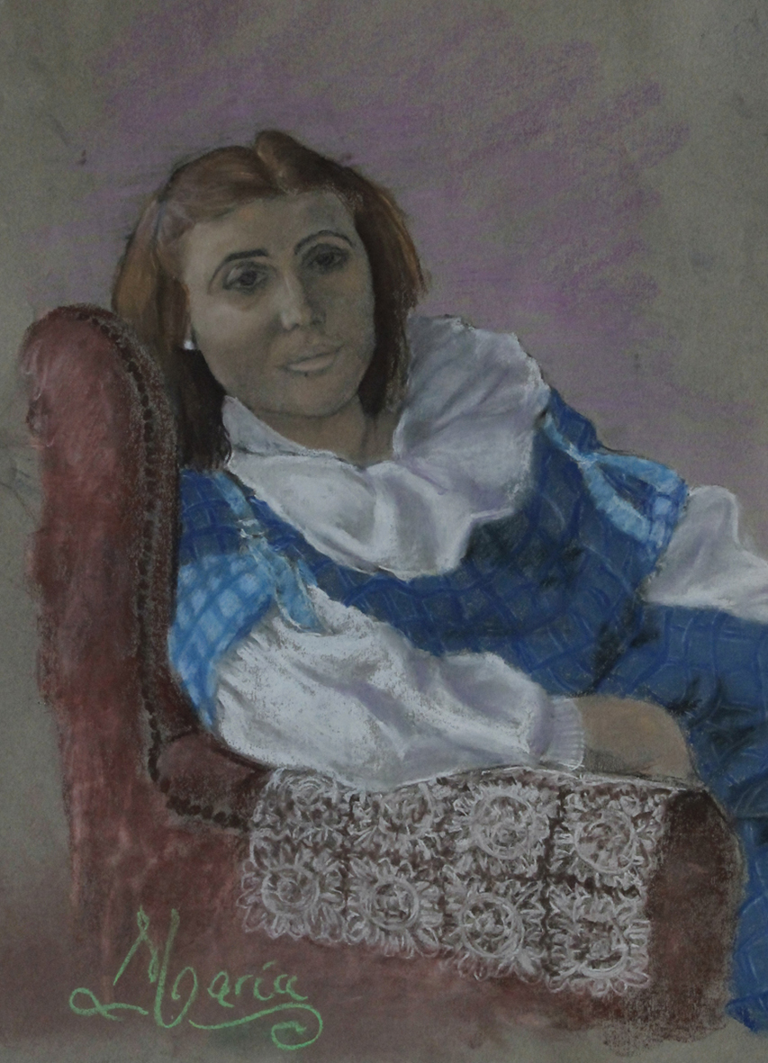 7/9 - Retrato a pastel de mi hermana pequeña. Estudio de la postura, dificultad en el dibujo de las manos.