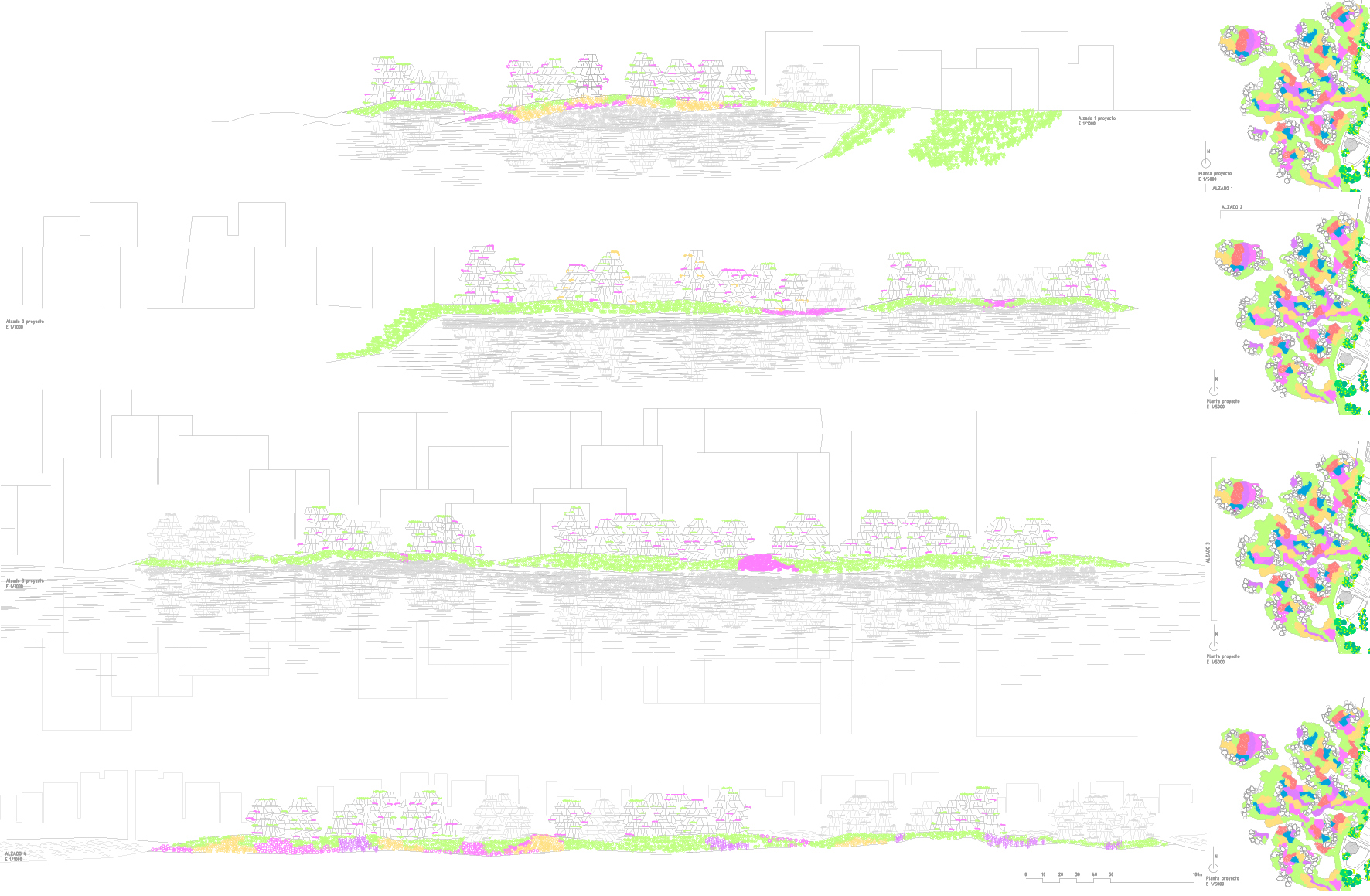 9/10 - Alzados tipo. Se repiten las geometrías de planta y sección. Lenguaje escultórico por el uso de hormigón. La vegetación coloniza el edificio, lo integra dentro del parque.