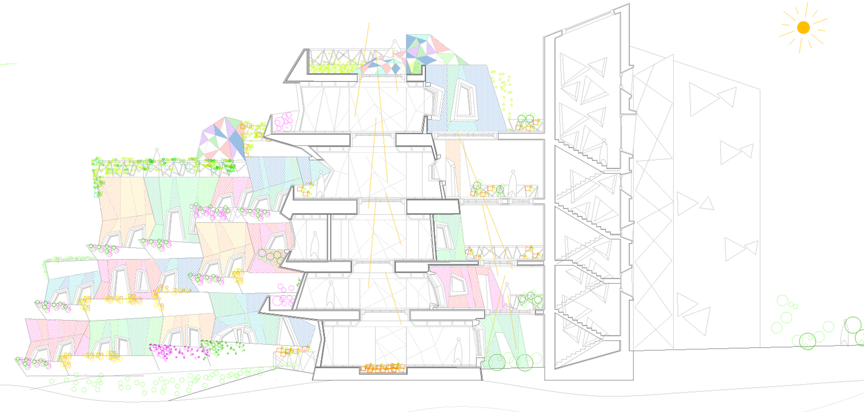 7/10 - Secciones transversales tipo. Un lucernario atraviesa todo el edifico en sección.